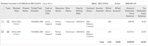 - Adjustments to block and retainer purchases show 0.00 billable hours. Adjustments to Non-block Deductions show the billable amount added or deducted.