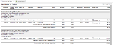 This report provides detailed revenue, cost, and profit information, grouped by project. Data may be filtered by posted date. |