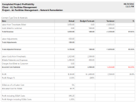 Project performance against budgets for labor, project charges, expenses and adjustments. |