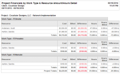Cost and amount billed, hours worked and hours billed, or both for the selected project(s), grouped by work type and totaled by resource.