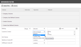 With the Advanced Filter on the Contact Group Detail and Add Contact to Group pages, you can filter on all columns available for display, without moving the columns into the table. You can also filter on additional columns that are not available for display in the table, including Organization and Contact UDFs.