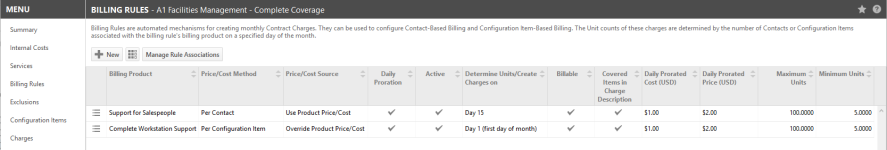 Contract billing rules are accessed from the contract menu by clicking the Billing Rules link. A table displays a list of all billing rules that have been created for this contract.