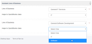 2. Map each division:line of business to a QuickBooks class. Any lines of business that are not mapped to a class will default to the mapping selected on the Settings page.