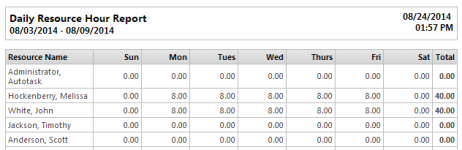 Daily resource hours for the time sheet period that contains the selected date. Helps you check if everyone is filling in their timesheet. |