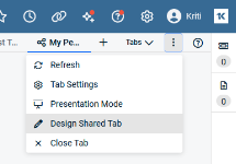 Any user with permission to manage shared dashboards can design and modify any shared tab from the Shared Dashboard Tabs page and the tab menu of the published tab. When you design a shared tab, any changes you make will apply to all published instances of the dashboard. Changes will show in the published dashboard tabs as soon as they are refreshed either manually or by schedule. To modify the settings of a shared tab, do the following: