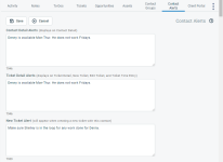 Ticket Detail Alerts | This alert appears on the New Ticket, Ticket Detail, Edit Ticket, and Ticket Time Entry pages for all tickets associated with this contact. |