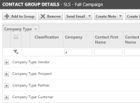The column label moves to the left side of the row above the column headings. The table re-sorts into groups of contacts that share the same value in the group by column; for example, if you group by a column for the Organization Type field, all contacts that share the same organization type will be grouped.