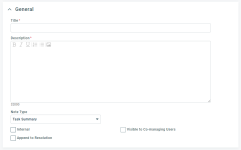 The Note Type field defaults to Task Summary. You can select a different note type from the drop-down list. All active note types of the category Task are available, plus the current selection even if it is inactive. If you select a different note type, keep in mind that it might be set to a different Publish option. Review the setting of the Internal Only check box. Special situations: