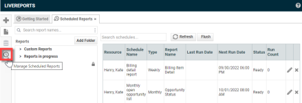 - If the Scheduled Reports tab is not visible, click the schedule icon in the far left tools menu to display the tab.