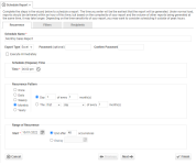 Use this tab to give the schedule a name, select the export type for the scheduled report, and set the schedule for the report delivery. You can schedule a report for a one-time, daily, weekly, monthly or yearly delivery at a set time. You can also set a date range for the report delivery to define the start and end dates.